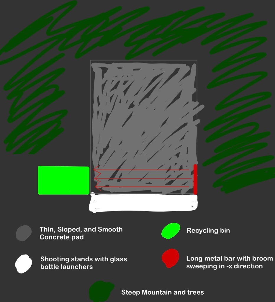 The RRR will reward any Recycling Redneck (RR) or person which saves their glass bottles from being shattered on the side of a road. This rewards comes by having a small compressed air cannon that launches cleaned and empty glass bottles into the air. The RR will then use a shotgun to shoot the glass bottle where the shattered pieces fall onto a smooth, thin, and sloped concrete pad. The glass pieces collect at the bottom, and when there is enough glass, a large automatic sweeper moves the glass into a recycling bin for a truck to pickup.